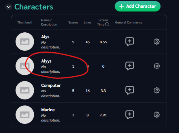 Click the Settings (gear) icon, and delete the duplicate character. The confirmation box warns that the character you are deleting has existing dialog. In the “Assign dialog to:” field, select the correct character. This reassigns all dialog from the typo character to the real character.